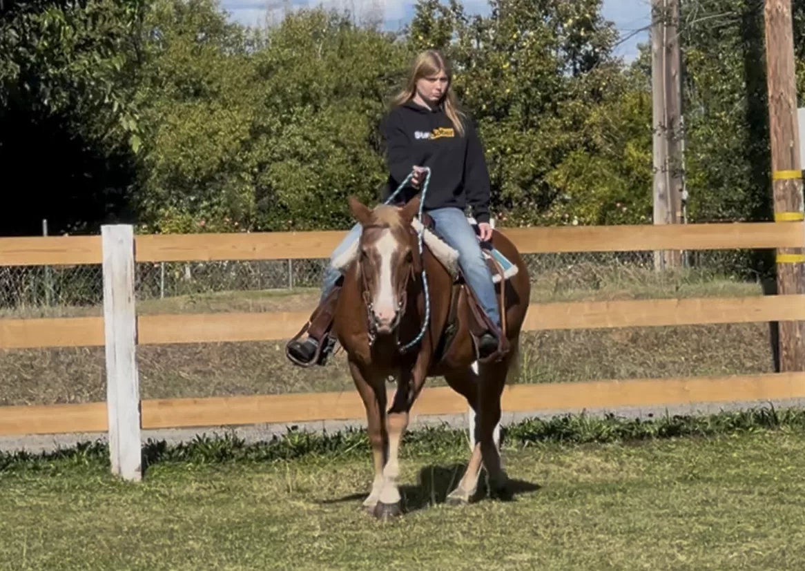 Peppy is an older gal looking for a family to love her through her retirement years. But don’t let her age fool you! Still full of pep, she is a joy to ride at the walk and trot. Used lightly as a trail horse in her earlier years, her body is in great shape for a 27 year-old. Peppy is sweet, good with kids and/or senior humans, and nurturing and kind towards other horses. She has always lived with other horses so will not be suitable as an only horse.